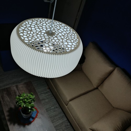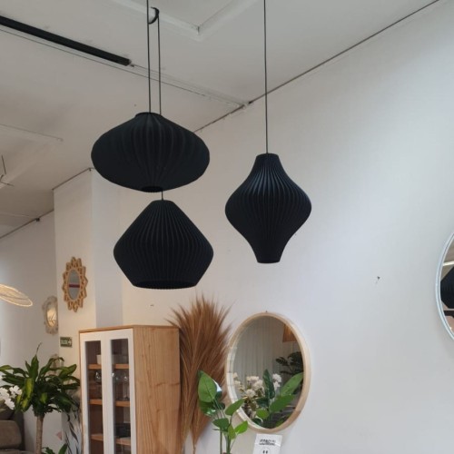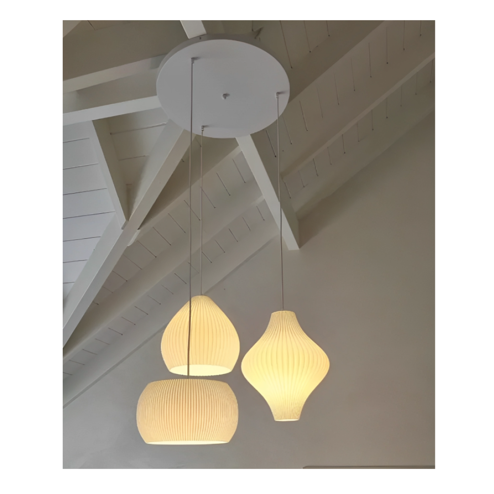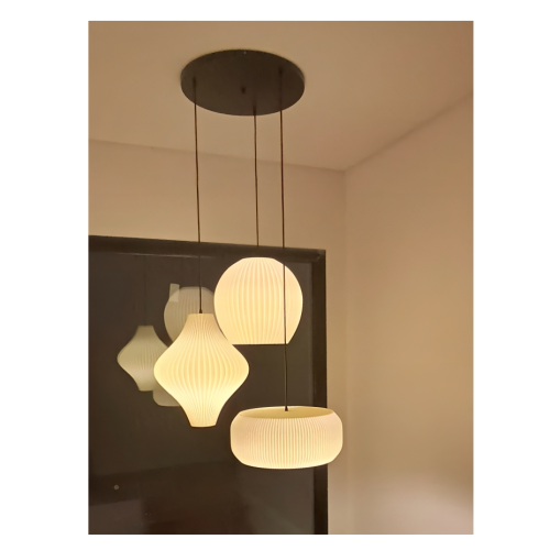Lámparas colgantes de 30 cm de diámetro cada una con florón de techo redondo de 50 cm de diámetro color blanco, todas con porta lámparas E27, cable forrado, color blanco o negro a elección, color de las tulipas puede ser en Blanco, Natural, Beige o Negro, se entregan con 1.5 metros de cable cada lámpara, pero se puede solicitar a medida.
