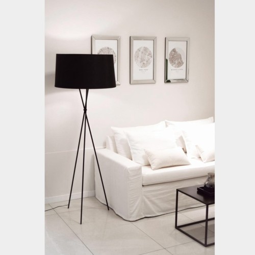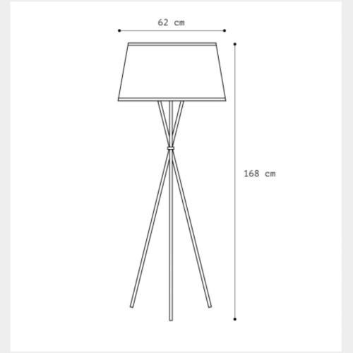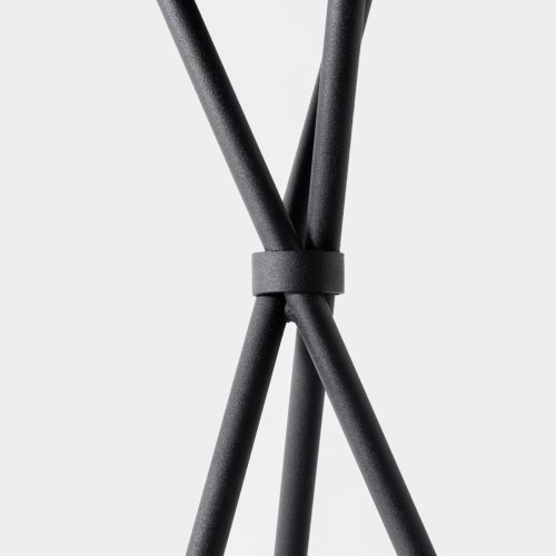 Pedestal compuesto de tres patas unidas por una pieza circular doblada a mano. Portalámparas en capuchón cónico con doble arandela de seguridad. Cable inyectado y pulsador de piso ON/OFF.